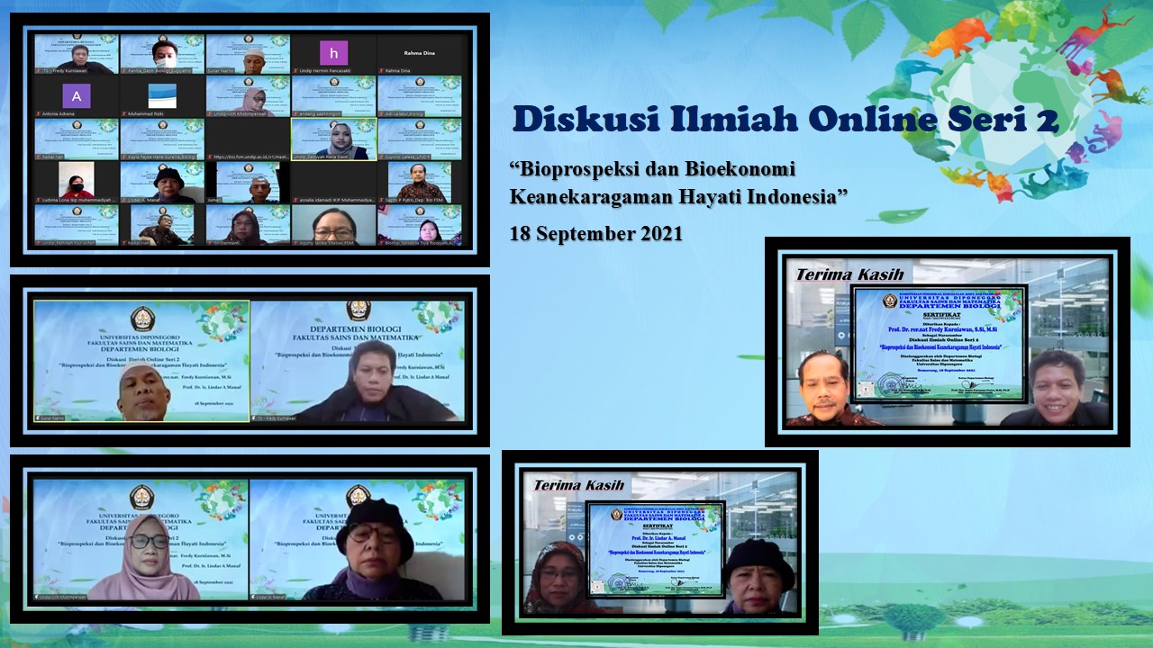 bio.fsm.undip.ac.id. Departemen Biologi Fakultas Sains dan Matematika Universitas Diponegoro Semarang menyelenggarakan Diskusi Ilmiah Online Seri 2 dengan tema “Bioprospeksi dan Bioekonomi Keanekaragaman Hayati Indonesia” pada Sabtu (18/9) diikuti peserta dari penjuru tanah air. Acara ini diselenggarakan sebagai bagian dari program kuliah umum Departemen Biologi secara berseri dengan tujuan untuk menambah wawasan civitas akademika dan masyarakat umum sehubungan dengan bidang kajian Biologi.