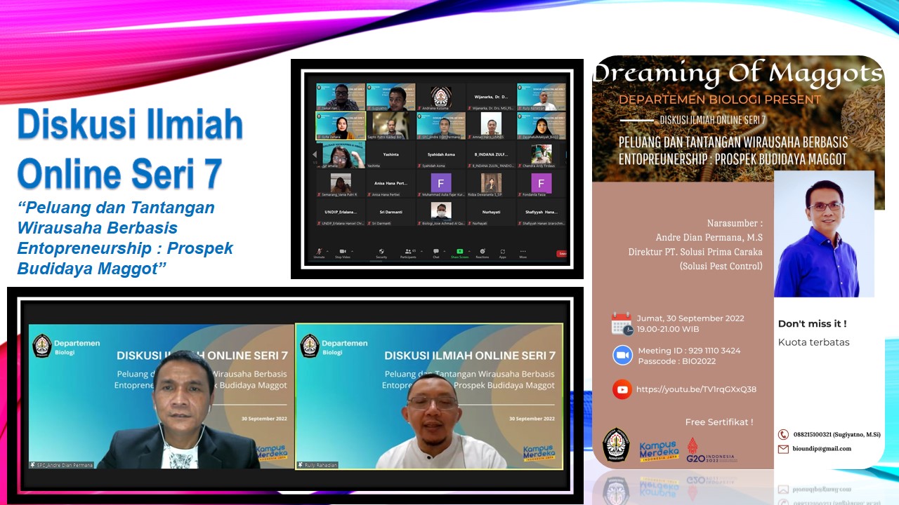bio.fsm.undip.ac.id. Black Soldier Fly (BSF) atau yang lebih dikenal dengan lalat tentara hitam ternyata memiliki potensi penting untuk pengembangan wirausaha berbasis entopreneurship. Larva BSF dan sering kenal sebagai “Maggot” ternyata memiliki manfaat sebagai pengurai bahan organik (Pengomposan), Pakan hewan ternak, Sumber kitin, penghasil minyak dan frass/ Pupuk. Dalam rangka meningkatkan pemahaman dan kompetensi mahasiswa dalam bidang wirausaha khususnya yang terkait dengan bidang kajian Biologi Serangga, Departemen Biologi pada Jum’at (30/9) menyelenggarakan kegiatan Diskusi Ilmiah Online seri 7 dengan tema “Peluang dan Tantangan Wirausaha Berbasis Entopreneurship : Prospek Budidaya Maggot”. Kegiatan ini menghadirkan secara khusus narasumber yang kompeten di bidang Entopreneurship yaitu Andre Dian Permana, S.Si, MM. Beliau adalah Direktur Utama PT. Solusi Prima Caraka Bandung.