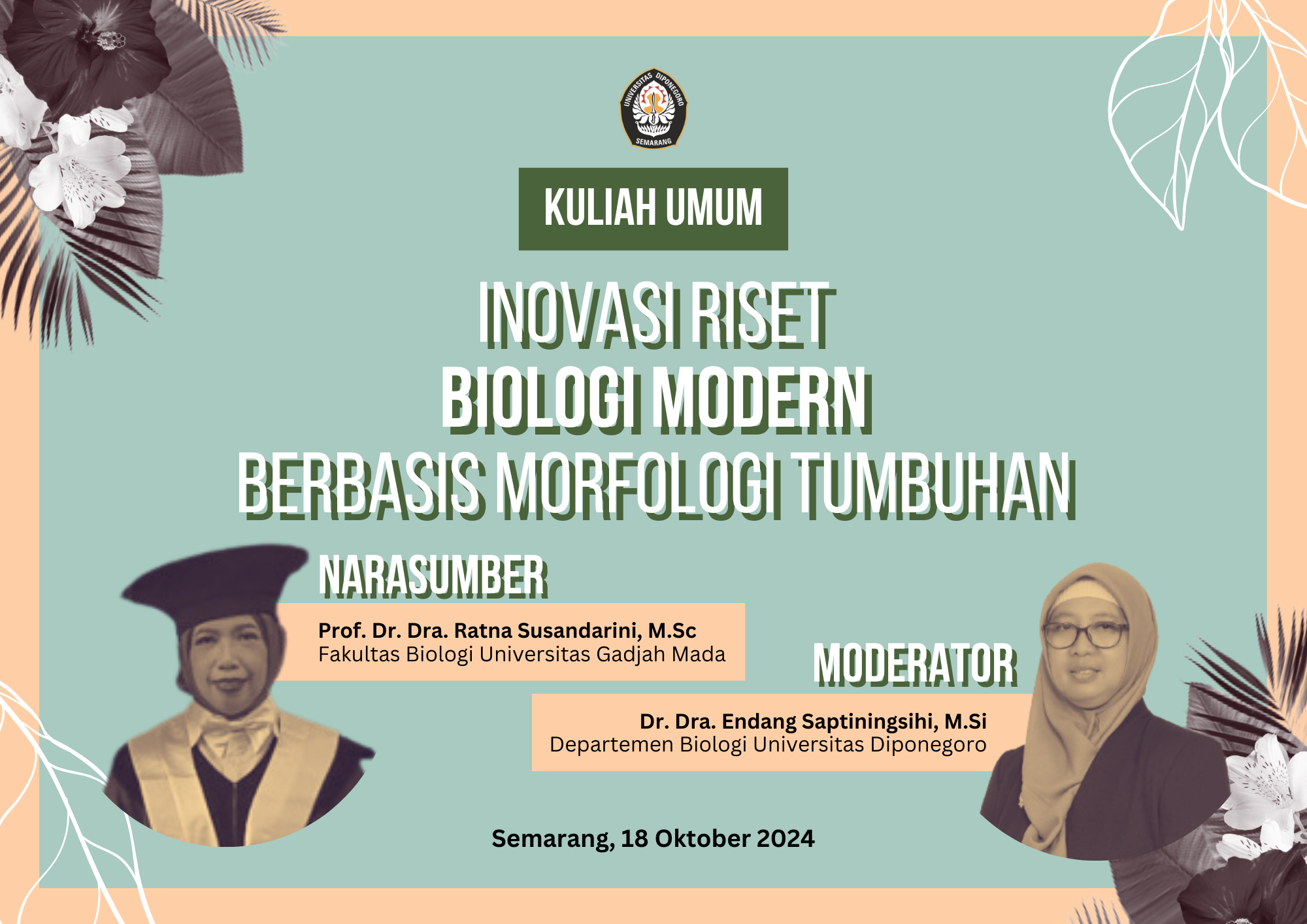 bio.fsm.undip.ac.id – Program Studi Biologi Universitas Diponegoro menyelenggarakan kuliah umum yang mengangkat topik “Inovasi dalam Penelitian Biologi Modern Berbasis Morfologi Tumbuhan”. Kegiatan kuliah umum kali ini menghadirkan narasumber Prof. Dr. Dra. Ratna Susandarini, M.Sc. dari Fakultas Biologi Universitas Gadjah Mada. Acara ini turut dibantu oleh moderator Dr. Endang Saptiningsih, M.Si. dari Departemen Biologi Universitas Diponegoro. Kegiatan kuliah umum diwarnai antusiasme yang besar oleh mahasiswa aktif dari Program Studi Biologi Universitas Diponegoro yang hadir di Ruang Konferensi Gedung G lantai 3 Fakultas Sains dan Matematika Universitas Diponegoro.