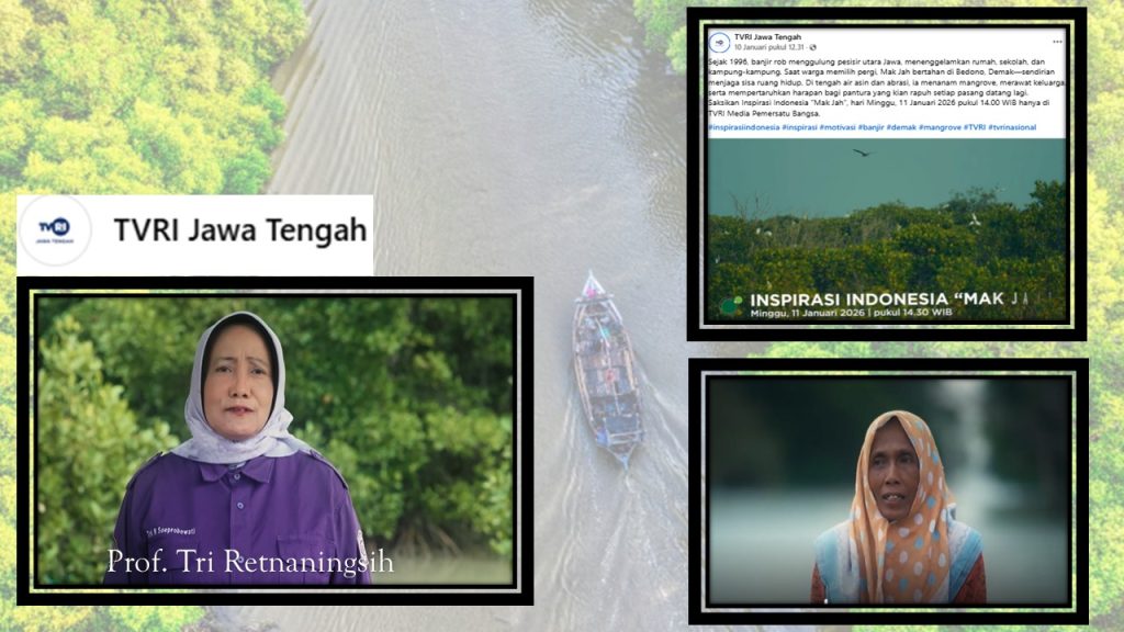 Prof. Dr. Tri Retnaningsih Soeprobowati, M.AppSc, dosen dan peneliti Departemen Biologi Fakultas Sains dan Matematika Universitas Diponegoro (Undip) Semarang, tampil sebagai pakar ahli lingkungan dalam program Inspirasi Indonesia bertajuk “Mak Jah” yang disiarkan TVRI Jawa Tengah, Minggu (11/1/2026) pukul 14.00 WIB. (https://www.facebook.com/share/v/1BvVBMe9Yj/)