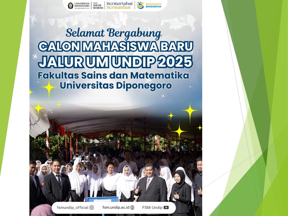 Fakultas Sains dan Matematika Universitas Diponegoro dengan bangga mengucapkan selamat datang kepada seluruh Calon Mahasiswa Baru FSM UNDIP yang telah dinyatakan lolos melalui Jalur Ujian